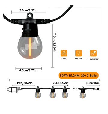 DC24V 6W adapter output, total length 50FT, XTW 20AWG/2C wire with 20 PCS G45 waterproof socket with bulb,steady on, 2700K add 2 spare bulb