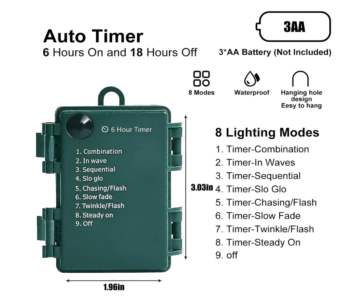 6hours timer with 8 model functions, 3X AA battery, (battery not included)